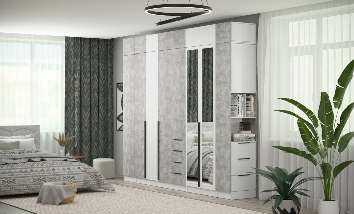 Шкаф оснащен вместительными полками и отделениями для хранения различных предметов гардероба. Просторный 4-х створчатый шкаф с зеркалом обеспечивает достаточно места для хранения всего гардероба, а зеркальная поверхность визуально расширяет пространство комнаты. Дополнительный 2-х створчатый шкаф предоставляет дополнительное место для хранения одежды.